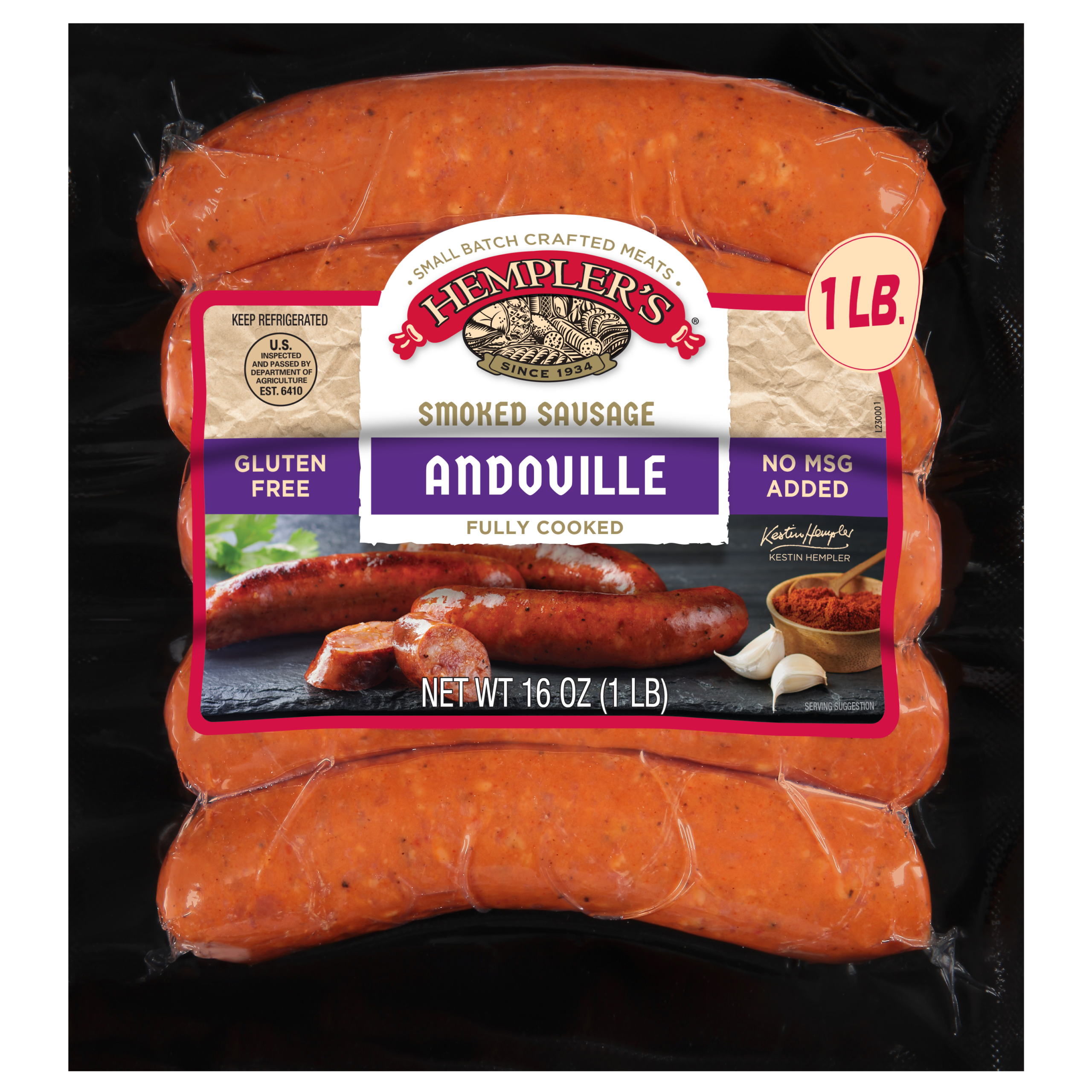 We use only the finest ingredients and lean cuts of meat in our Cajun-style Andouille, specially blended for a firm texture and bite. Smoked over natural hardwoods for a rich aroma and taste. Completely FREE of allergens, gluten and MSG. Great for sandwiches, soups, stews, red beans & rice, or on the grill.