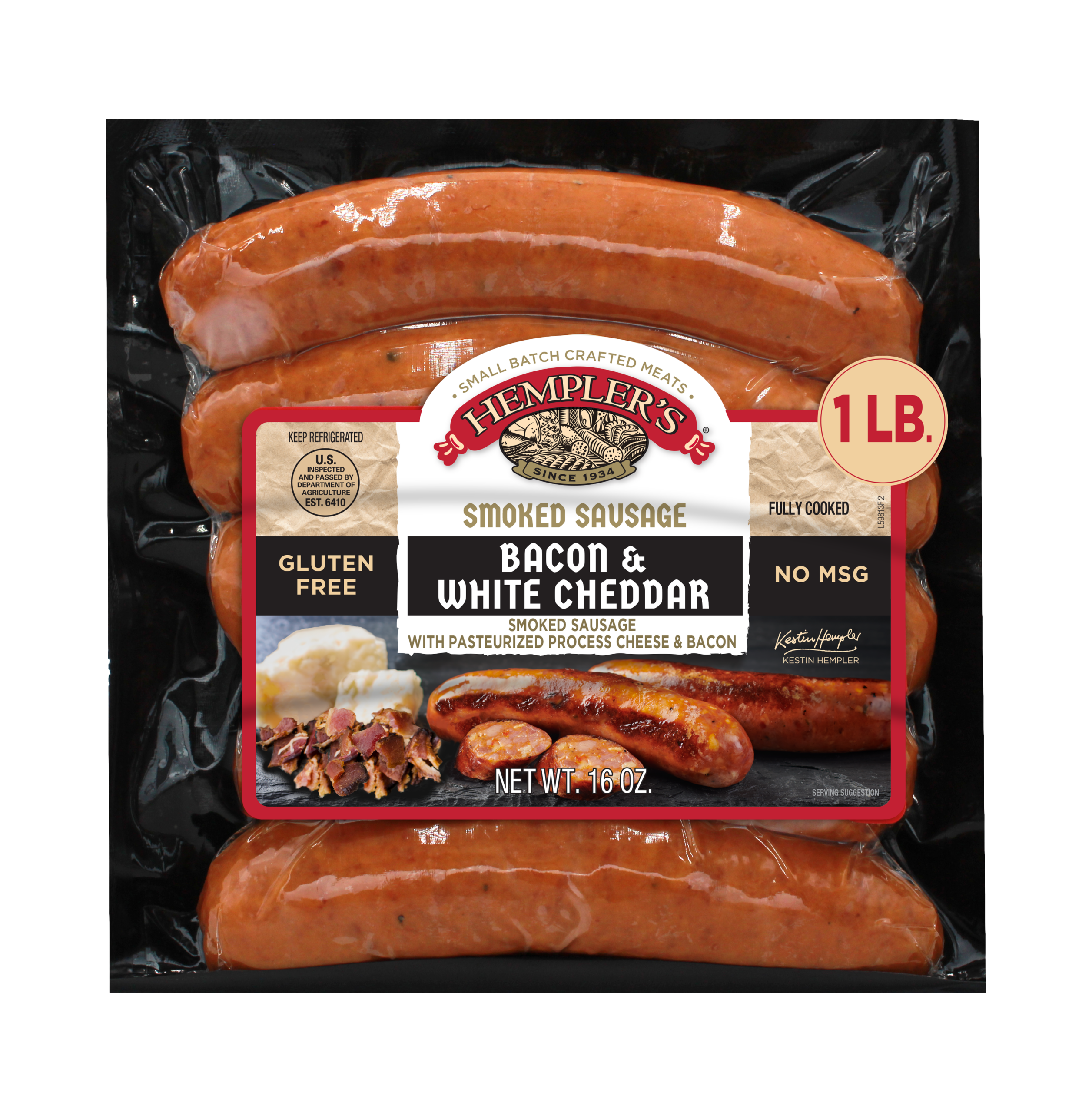 Made in the Hempler family tradition of time-honored, artisan recipes. We use only the finest ingredients and high quality meat in our smoked sausage, specially blended for a firm texture and bite, and infused with generous chunks of creamy, white cheddar and our delicious smoked bacon. Smoked over natural hardwoods for a rich aroma and taste. Our smoked sausage does not contain eggs, fish, shellfish, tree nuts, peanuts, wheat or soybeans, and is free of gluten and MSG. Great for soups, stews, or on the grill.